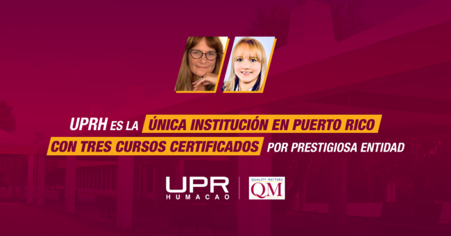 UPRH única institución en PR con tres cursos certificados por prestigiosa entidad El Dr. Carlos A. Galiano Quiñones, rector interino de la Universidad de Puerto Rico en Humacao (UPRH), anuncia la certificación de la calidad del diseño de dos cursos bajo la rúbrica Quality Matters (QM). Tras este logro, la institución cuenta con tres cursos certificados, siendo…