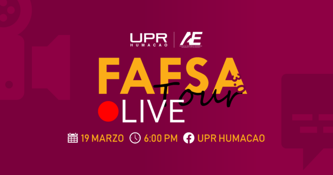 UPRH anuncia FAFSA Tour Live La Universidad de Puerto Rico en Humacao (UPRH) anuncia el FAFSA Tour 3.0 LIVE, una sesión informativa especial a través de Facebook UPRH el martes, 19 de marzo de 2024 a las 6:00 p.m. El evento es coordinado por la Oficina de Asistencia Económica de la institución. “Esta iniciativa demuestra…