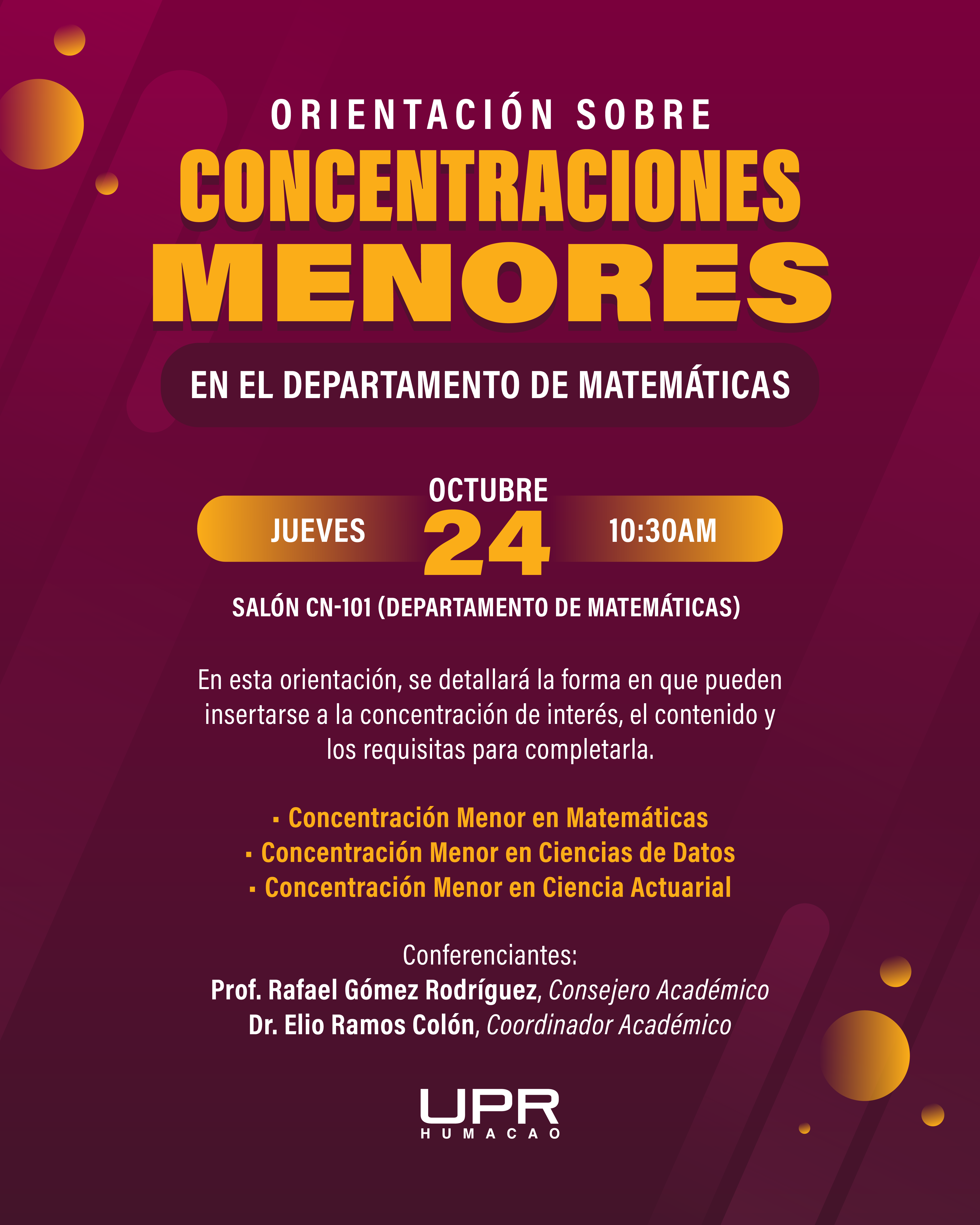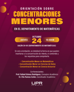 Orientación sobre tres concentraciones menores del Departamento de Matemáticas: Concentración Menor en Matemáticas, Concentración Menor en Ciencia de Datos, Concentración Menor en Ciencia Actuarial