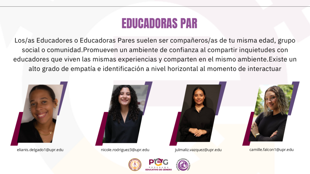 El Programa Educativo de Género (PEG) de la Universidad de Puerto Rico en Humacao es una iniciativa que busca crear un entorno universitario seguro, inclusivo y libre de violencia para todas las personas, sin importar su identidad o expresión de género. Su misión es prevenir y atender la violencia y discriminación de género mediante la educación, el diálogo y el acompañamiento, promoviendo una cultura de respeto, equidad y justicia. El programa reconoce la importancia de visibilizar todas las identidades de género y orienta a la comunidad universitaria sobre el uso de lenguaje inclusivo, la empatía y la solidaridad.