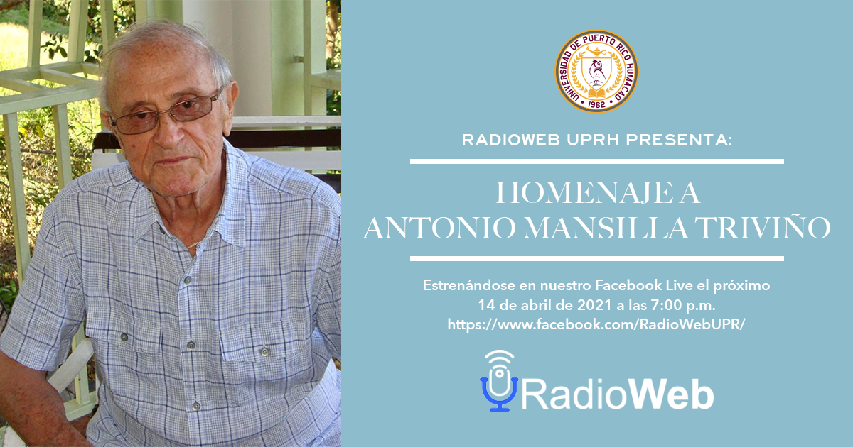 (Humacao, P.R.) – Hace unas semanas, seis testigos de la apasionada vida de Antonio Mansilla Triviño se dieron cita en la red de audio digital Radio Web, para honrar la memoria del recién fallecido profesor emérito de la Universidad de Puerto Rico en Humacao (UPRH). En homenaje a este gran educador, Radio Web, también, publicó el conversatorio para el deleite del público general en su página de Facebook @RadioWebUPR.
