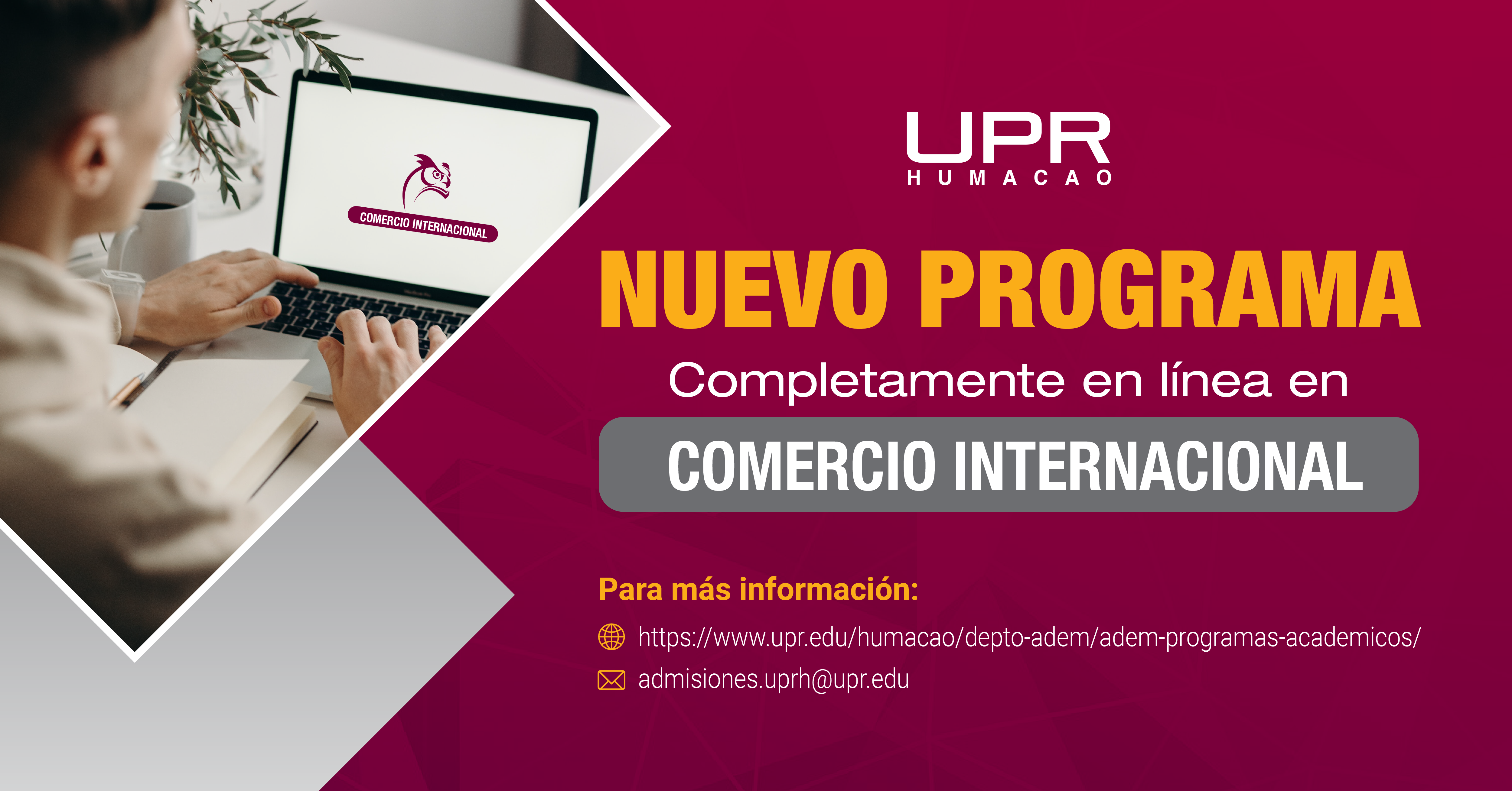 (Humacao, P.R.) – A partir de agosto de 2021, la Universidad de Puerto Rico en Humacao (UPRH) y su Departamento de Administración de Empresas (Adem) ofrecerá el programa de bachillerato en Administración de Empresas con concentración en Comercio Internacional en línea. Esta iniciativa, atemperada a las circunstancias y nuevas estrategias de enseñanza/aprendizaje, amplía la oferta académica brindando mayor oportunidad a todos los estudiantes.