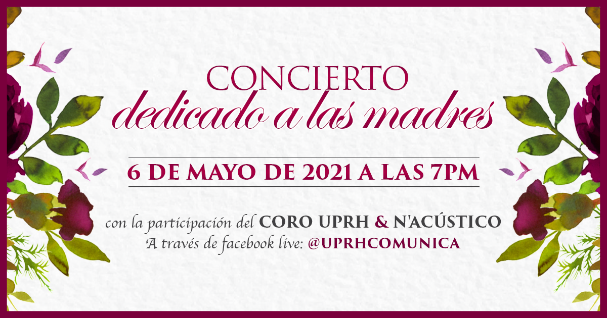 (Humacao, P.R.) – La Dra. Aida I. Rodríguez Roig, rectora de la Universidad de Puerto Rico en Humacao (UPRH) anuncia la celebración del concierto Porque amaste, porque amas y amarás, en homenaje a las madres. El evento se transmitirá el jueves 6 de mayo a las 7:00 de la noche por la plataforma de Facebook @UPRHComunica.