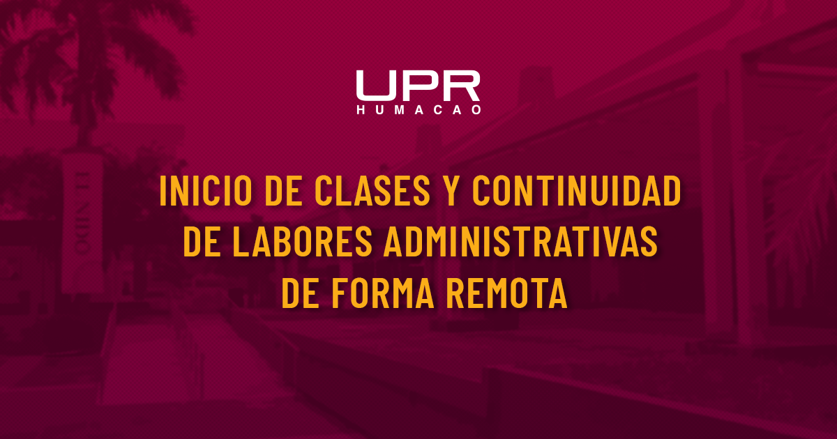 Las clases en la institución iniciarán el 18 de enero de 2022 de manera remota asistidas por tecnología y continuarán de esta forma hasta finales del mes de enero. Esta determinación fue establecida por la Dra. Mayra Olavarría Cruz, presidenta interina de la UPR tomando en consideración las medidas de prevención establecidas por el Gobierno de Puerto Rico, así como las recomendaciones del epidemiólogo, Dr. David Capó Ramos.