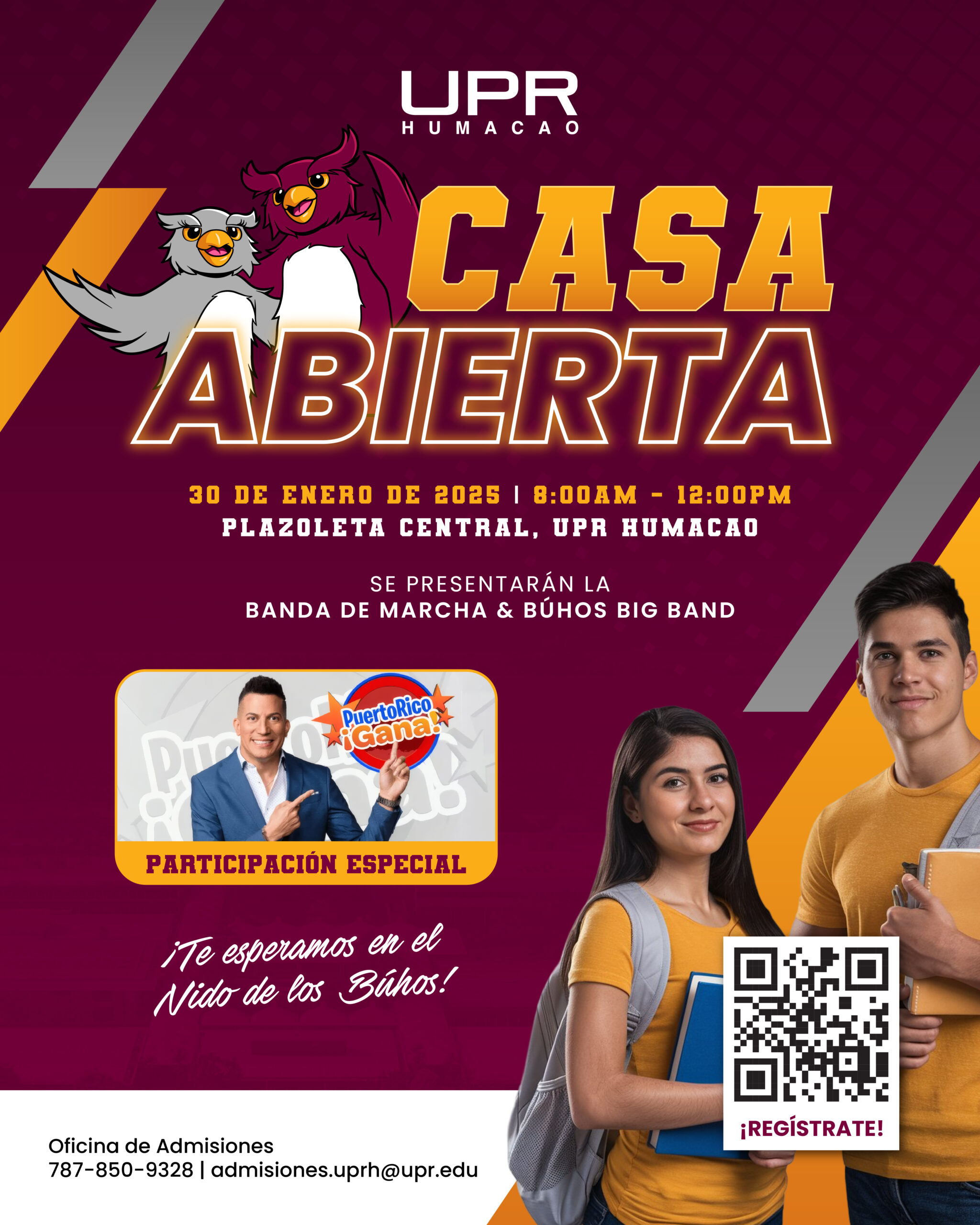 El Dr. Carlos A. Galiano Quiñones, rector de la Universidad de Puerto Rico en Humacao (UPRH), anuncia la celebración de la Casa Abierta para la comunidad, en especial para los estudiantes de escuela superior interesados en conocer la oferta académica y los servicios que la institución ofrece. El evento que se llevará a cabo el jueves 30 de enero de 8:00 a.m. a 12:00 p.m., contará con la participación especial de Alex DJ y el elenco de Puerto Rico Gana, la Banda de Marcha y la Búhos Big Band.